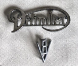Finally, I have an original Daimler 2.5 V8 boot lid Script logo from a 1965 double bumper model with a central "Disc Brakes" warning sign, even though you could never stop the darned things, it looked impressive! I’m afraid the two badges are all I have left of it as I scrapped the car due to a serious amount of "tin worm". The bonnet D emblem I reluctantly fitted to a 1970 SWB Daimler Sovereign I used as a show and wedding car. The flying D provided a hole at the front of the bonnet for the ribbons to go through 😀