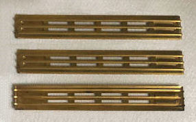 Early type '59 - '63 AC15/30 brass vents high quality reproduction, identical to the originals shown below for comparison, which are not for sale. The end four slots are masked by the fixing tangs which bend outwards to hold them in place. You don’t bend these more than you have to otherwise they break off. Any Vox owner, enthusiast would know that, but I thought it worth a mention, as we don't want people crying over spilt milk or broken tangs!