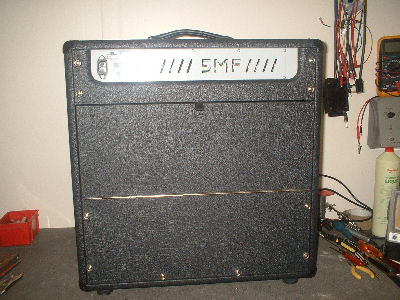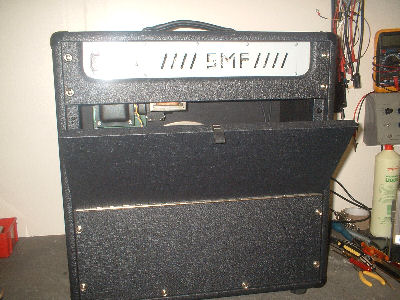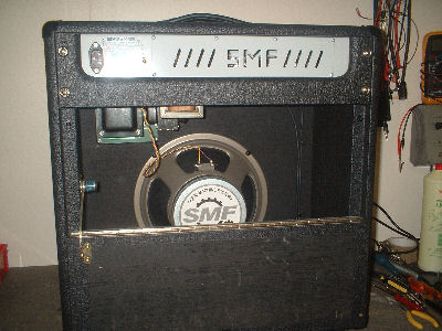 Many of you have asked about the S M F amplifier shown in a previous workshop picture of the home page. This is an "S M F 30 Watter" ( yes that is its model name) As its name suggests it is a 30 watt class A amp from the Mark Sampson stable of Matchless & Badcat . S M F stands for" Sonic Machine Factory" . Just like Matchless & Badcat amps, it is built like the proverbial brick outhouse, over engineered with the massive transformers and top class components. I think these were made during a spell of, shall we say between jobs, if you get my gist!