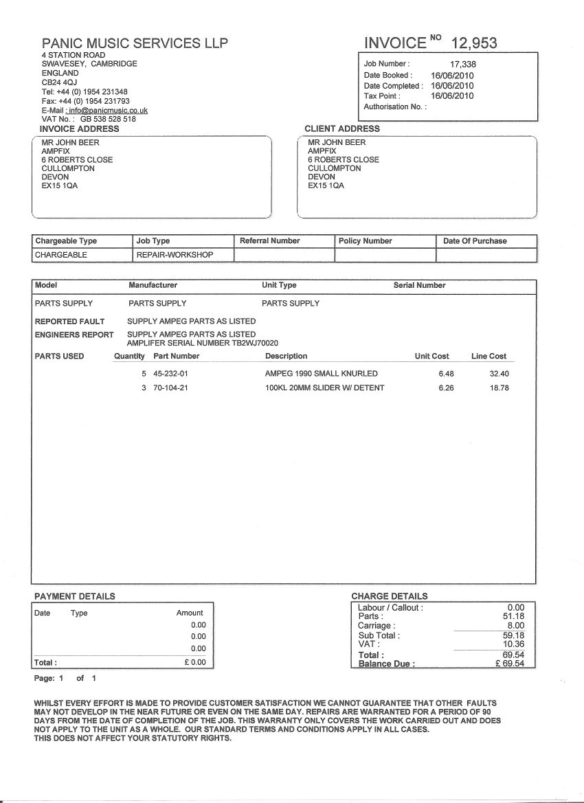 Below is a copy of the actual invoice from Panic Music Services. I'll leave it to you to decide who is making the money out of this repair!