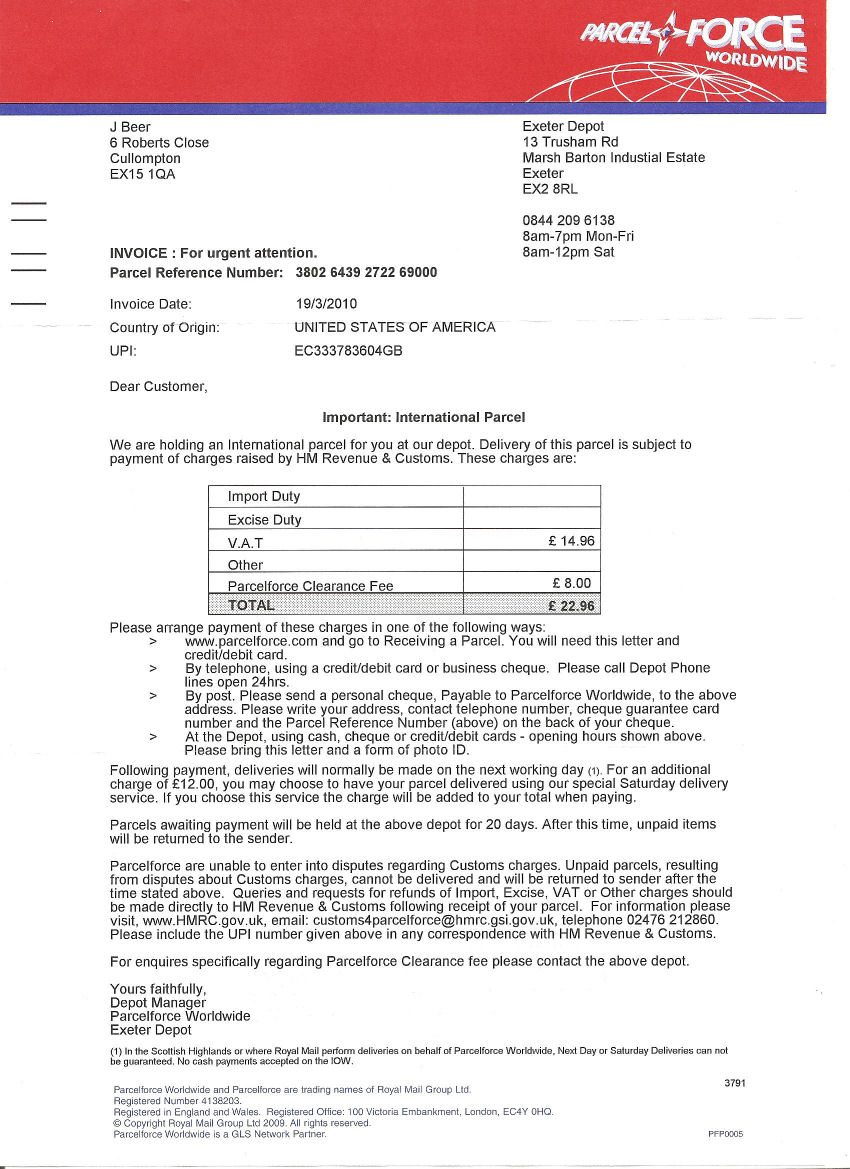 Below, is an invoice for another eight quid for the Parcelforce fat cats on top of the duty payable to the government, bringing the total to £26.96 instead of just £14.96. Who pays in the long run? Yea you've got it! (19th March 2010 )